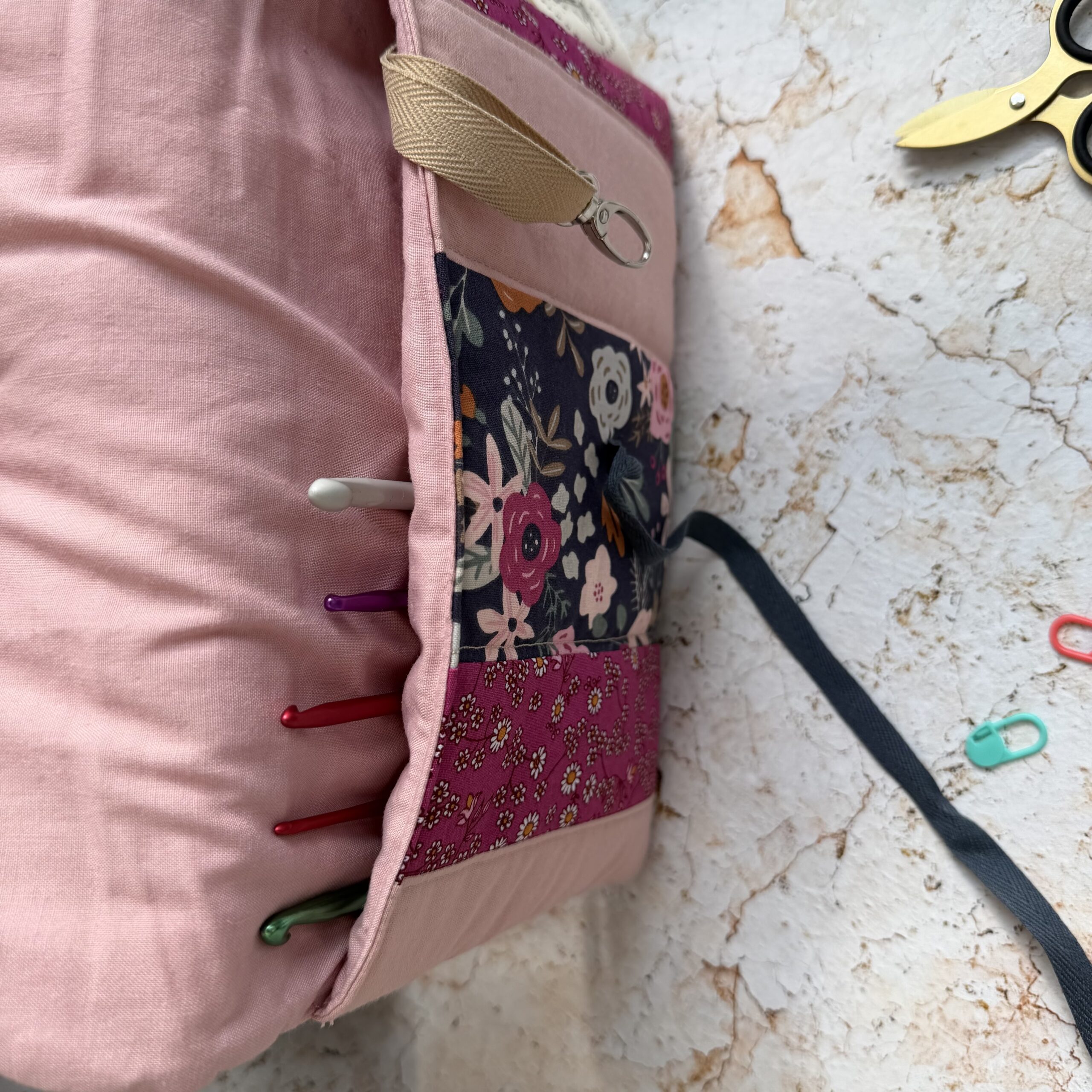 Poznaj ETUI stworzone z myślą o pasjonatach szydełkowania! Etui to praktyczne i stylowe rozwiązanie do przechowywania i przenoszenia szydełek oraz innych akcesoriów dziewiarskich. W środku znajdziesz kieszonkę na 5 szydełek, oraz jedną dużą kieszeń, która pomoże utrzymać porządek i szybko odnaleźć potrzebne narzędzia jak nożyczki, licznik rzędów oraz karabińczyk na pasku na znaczniki dziewiarskie.